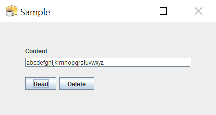 Read 버튼을 누르면 파일을 읽어 TextField에 표시하고, Delete를 누르면 파일을 삭제하는 간단한 Swing Application 이다.