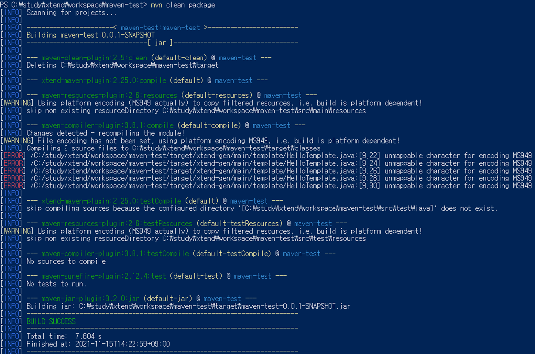 Windows의 기본 인코딩(MS949)으로 빌드했을 때, "unmappable character for encoding" 이라는 에러 메세지가 나왔지만, 역시 빌드 결과는 "BUILD SUCCESS"로 나온다.